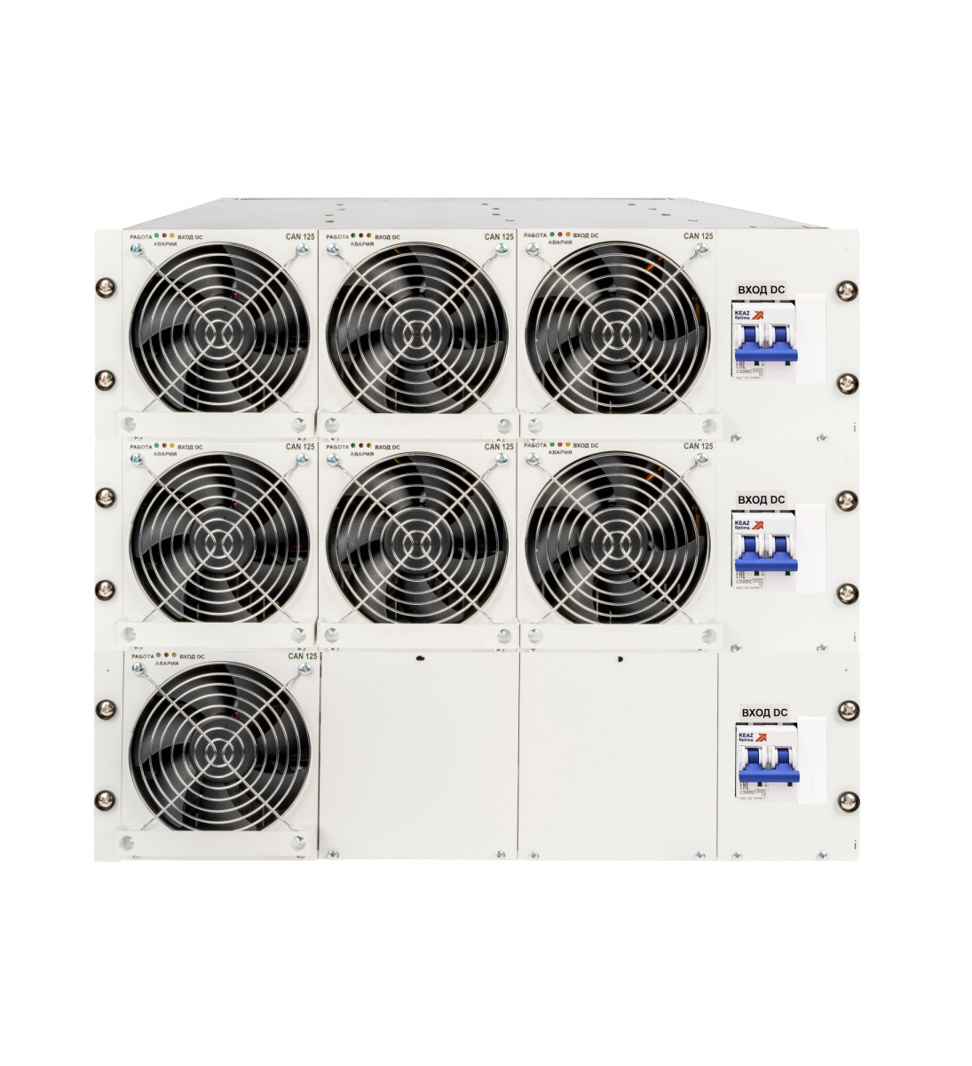 Инверторная система (DC-АС)/AC-(220-220)/220B-17500BA-9U, созданная на основе модульных преобразователей (DC-AC)/AC-(220-220)/220В-2500ВА-3U, является эффективным и надежным решением для питания различного электронного оборудования и средств связи переменным однофазным напряжением 220В с частотой 50Гц.
