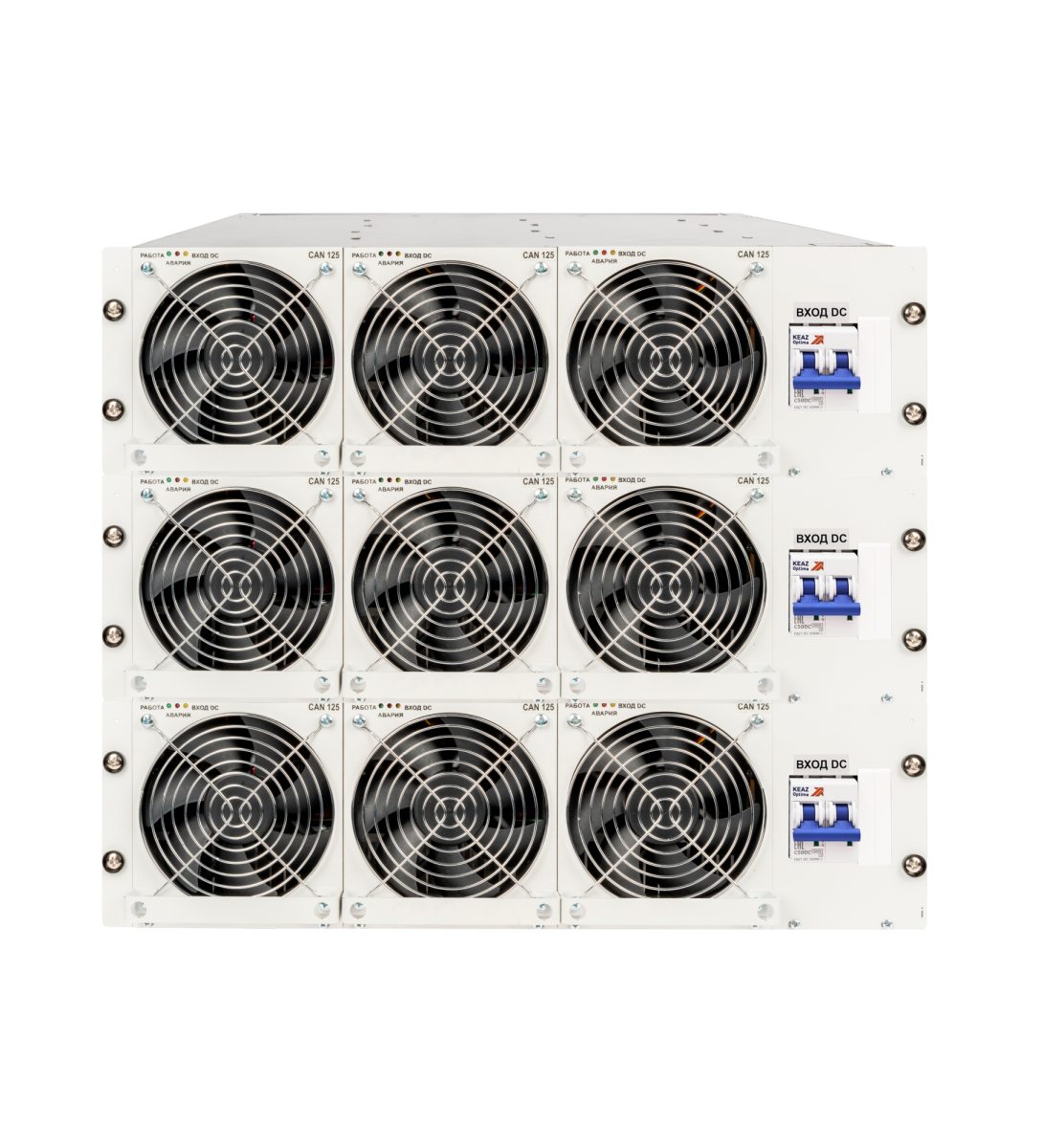 Инверторная система (DC-АС)/AC-(110-380)/380B-22500BA-9U, созданная на основе модульных преобразователей (DC-AC)/AC-(24-380)/380В-2500ВА-3U, является эффективным и надежным решением для питания различного электронного оборудования и средств связи переменным однофазным напряжением 380В с частотой 50Гц.