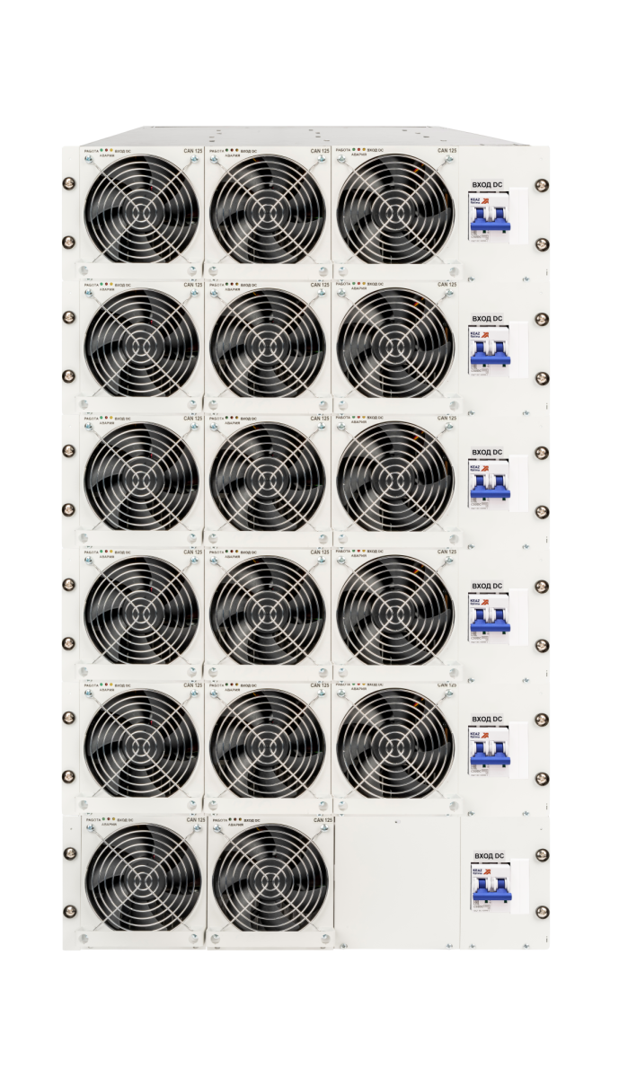 Инверторная система (DC-АС)/AC-(24-220)/220B-25500BA-18U, созданная на основе модульных преобразователей (DC-AC)/AC-(24-220)/220В-1500ВА-3U, является эффективным и надежным решением для питания различного электронного оборудования и средств связи переменным однофазным напряжением 220В с частотой 50Гц.