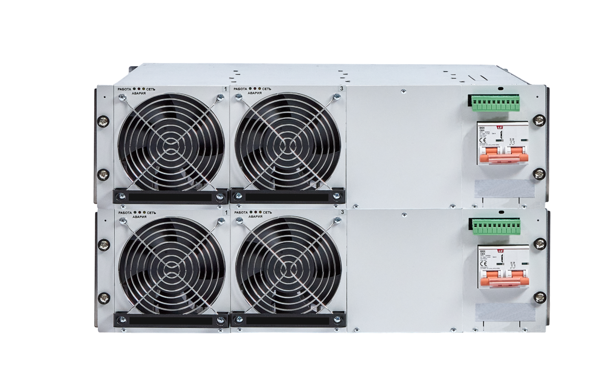 Конвертор выполнен в базовом конструктивном исполнении 19’’ высотой 3U. Вентилятор, который используется для охлаждения системы, интегрирован в модуль-конвертор. Это позволяет эффективно распределять и отводить тепло, генерируемое модулем-конвертором, предотвращая перегрев. Управление вентилятором осуществляется сигналом, поступающим с контроллера управления конвертором (УКУ). Конверторы используют модульную структуру, что позволяет обеспечивать возможность быстрой замены и резервирования силовых модулей-конверторов. Это также способствует созданию эффективных систем электропитания большой мощности.