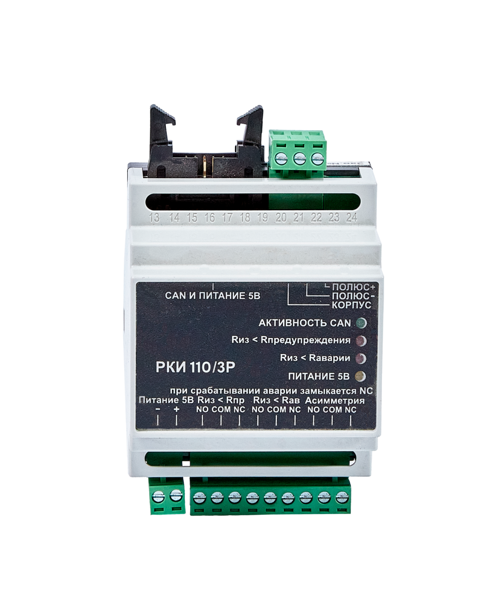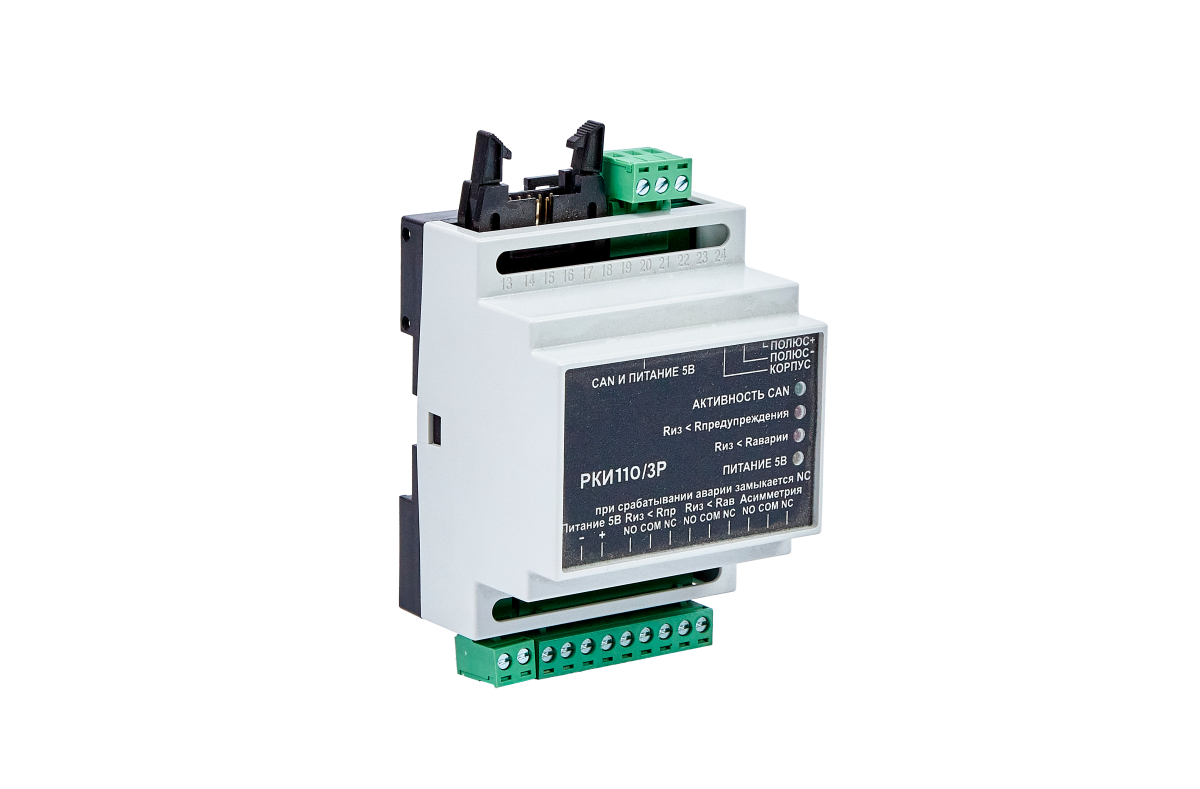 Реле контроля изоляции цепей DC 110В с изолированными от земли полюсами, 3 запрограммированных реле, мониторинг и управление только с УКУ. Питание DC 5В по линии CAN от УКУ или от внешнего источника. Рекомендуется использовать именно внешний источник, например, MDR-10-5.1